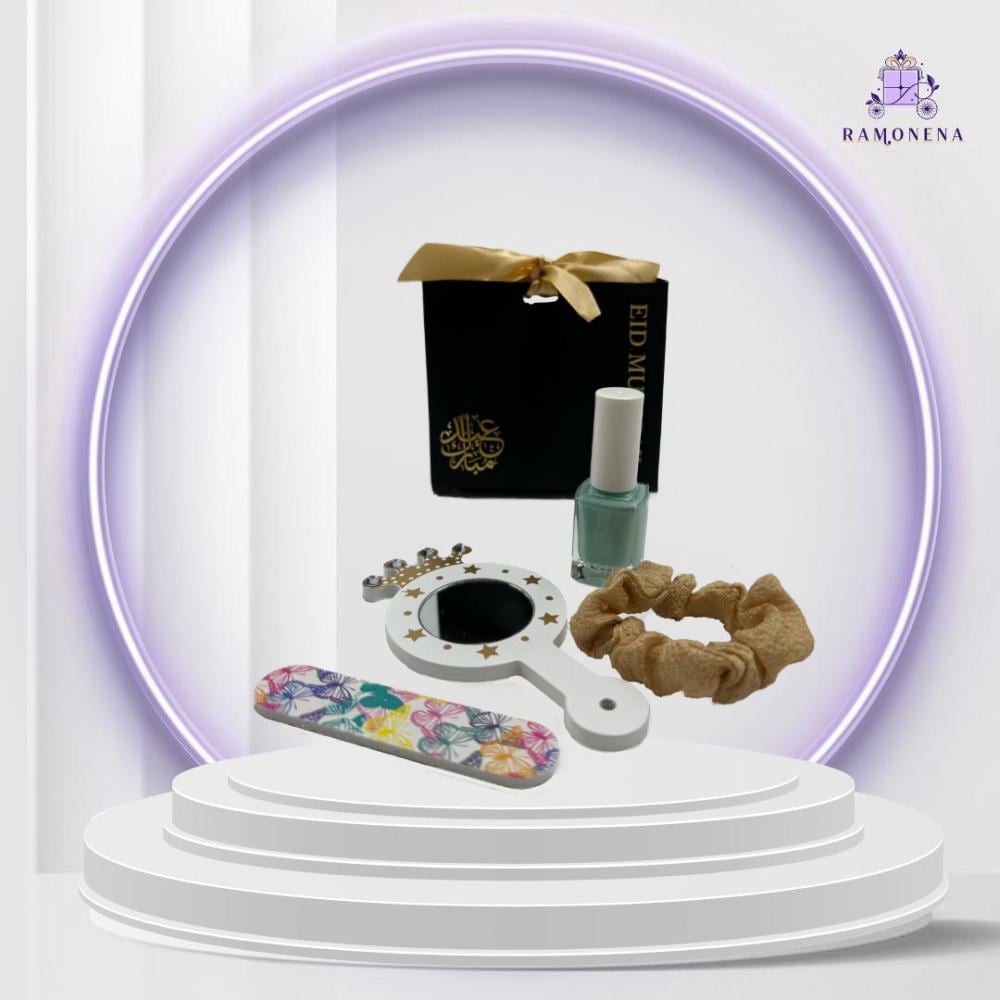 - توزيعات هدايا ذات علبة هدايا فاخرة باللون الأسود مكتوب عليها Eid Mubarak ومزينة بشريط ذهبي أنيق.